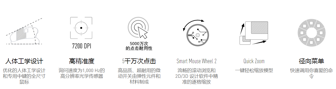 滑鼠按鍵的設計點擊數達到到5000多萬次。它採用高品質的耐用材料和組件進行設計,使用壽命更長。加上其經久耐用的設計,這意味著CAD專業人士可更加放心地享受高質量的使用體驗。