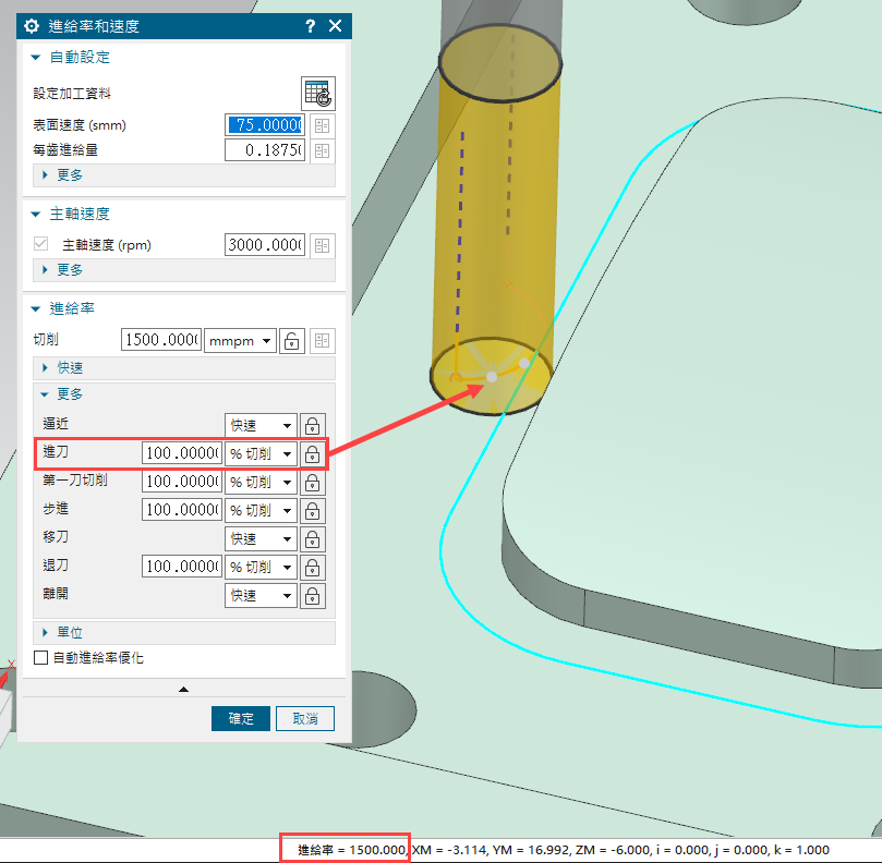 ※這樣設定就能分開設定進刀的進給(下刀路徑與圓弧進給路徑使用不同的進給率)。
