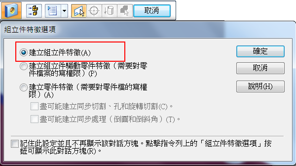 接著SolidEdge詢問我們,此特徵為組件特徵還是要寫入零件特徵中,我們選擇為組件特徵。
