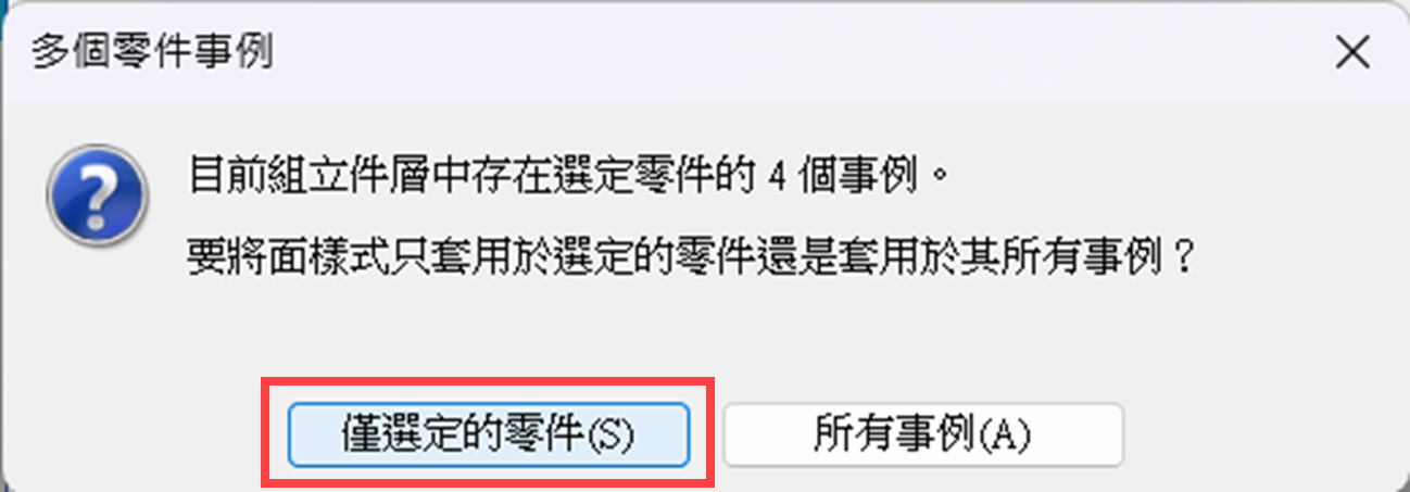 Solid Edge 多物件上色 – 2024/05/16 16 五月 Posted by Monica Category: 組立件 - 初階 無迴響 在 Solid Edge 組立件中,想要一次將相同的零件上色,又或是,想將整個次組立件一次塗上顏色, 可參考以下方式進行操作。 步驟1 步驟2 步驟3 步驟4 完成圖 打開「樣式板」,將想要使用的樣式拖曳至零件上,即可上色。 拖曳至組立件中具有複數個相同的零件上,則會跳出兩個選項: 【僅選定的零件】代表只上色在單一個零件上 【所有事例】則代表將所有相同物件都上色 若拖曳至次組件停留一下,待出現右鍵符號出現後放開左鍵,即會出現【快速選取】選單。 於選單內選擇上色的次組立件以及【所有事例】。 劉雨融 Yolanda Liu