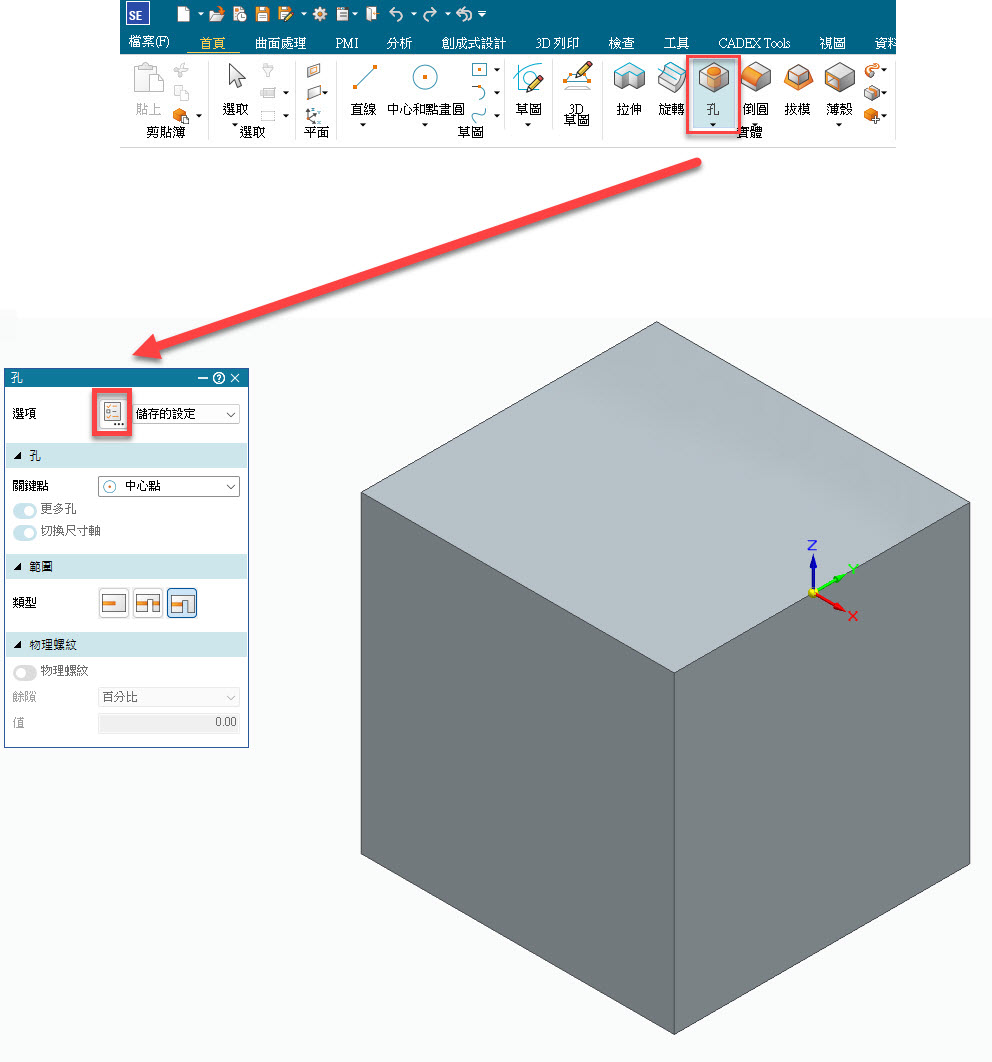 點擊「孔」功能,孔功能視窗開啟後,點擊「孔-孔選項」功能。