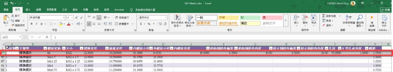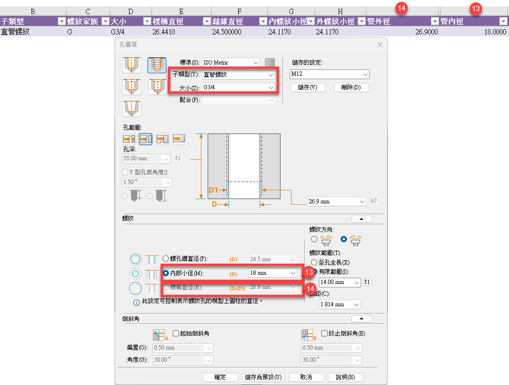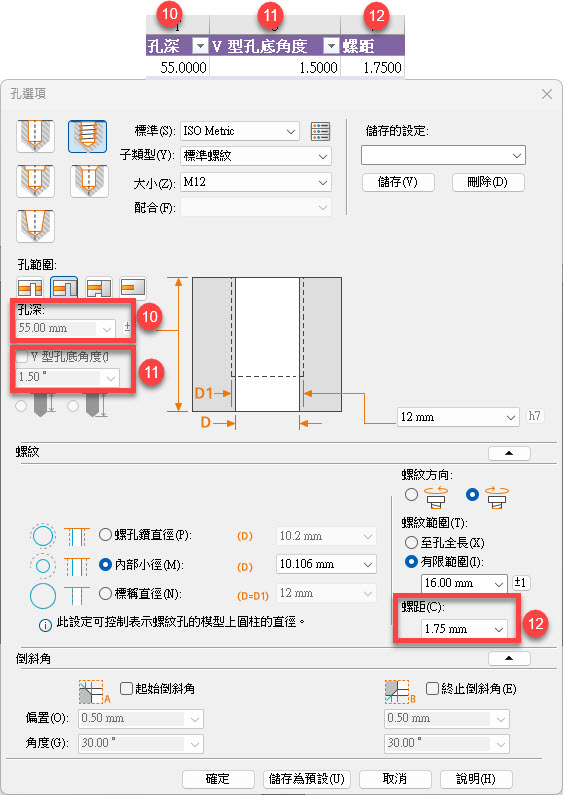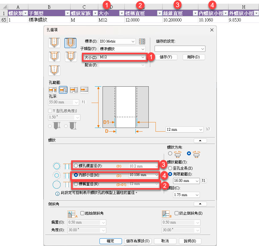 在EXCEL表格設定完後,將檔案儲存,進入孔表格功能後,只要選定M12的尺寸,系統會自動套用EXCEL設定好的參數。