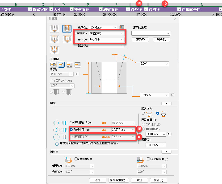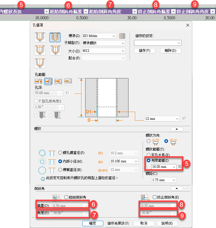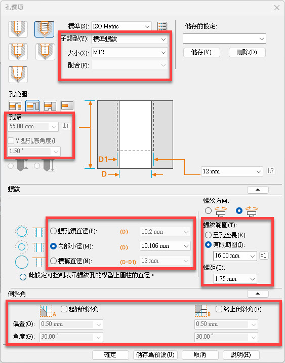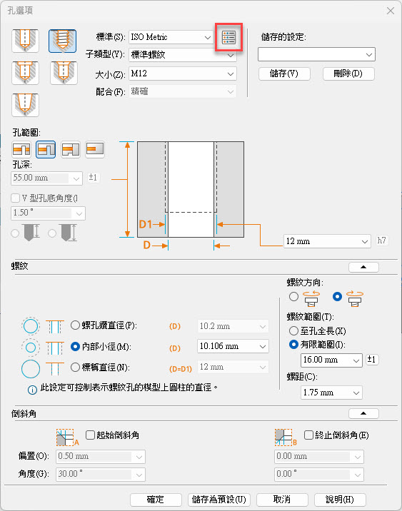 開啟孔選項功能後,可在此設定孔的尺寸、類型與螺紋等相關參數。