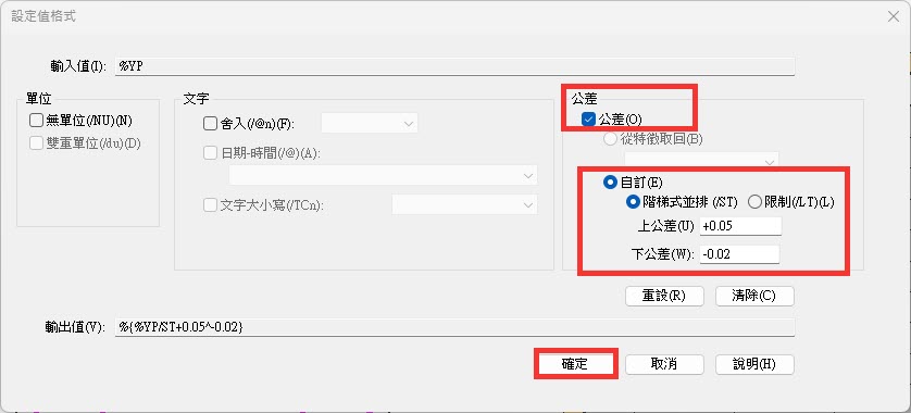 勾選「公差」功能,輸入 ± 公差值後,點擊「確定」。