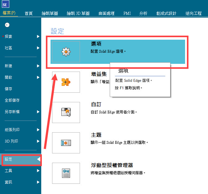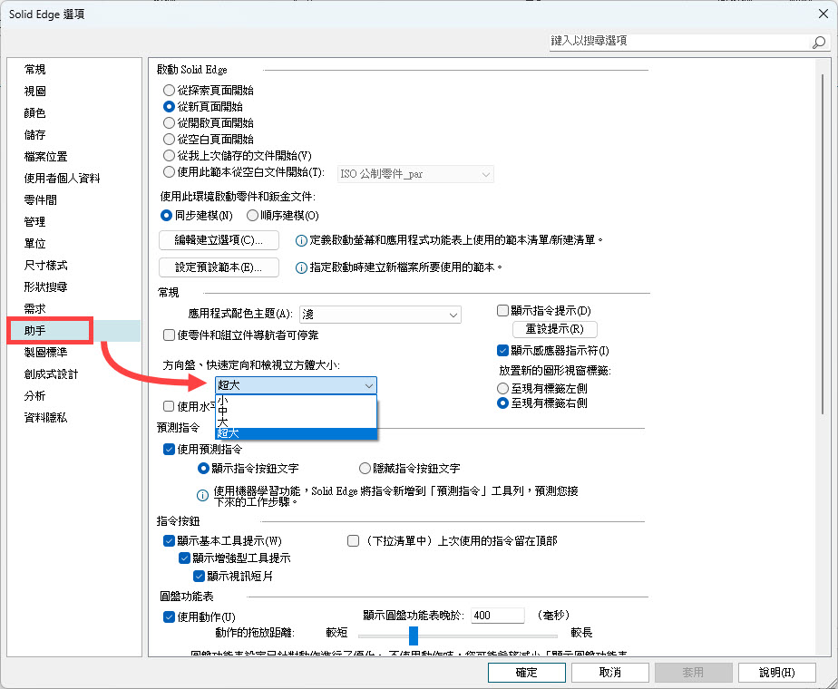 Solid Edge 幾何控制器尺寸調整 – 2026/01/21 21 一月 Posted by Monica Category: 環境設定 無迴響 操作 Solid Edge 時,如果覺得「幾何控制器」圖示過小,較難精確點選或誤觸, Solid Edge 在「環境設定」中提供了四種尺寸選項。 使用者可依據個人習慣與螢幕解析度,選擇最舒適的操作大小。 值得注意的是,調整此設定時,「視圖立方體」的大小也會同步變更,確保介面的一致性。 ※註:幾何控制器的顯示大小是依據「螢幕解析度」而定,單純縮放繪圖視窗並不會改變其尺寸。 1 2 開啟Solid Edge後,從「設定」→找到「選項」。 在「選項」→「助手」→「方向盤、快速定向和檢視立方體大小」,下拉有「小」、「中」、「大」、「超大」四個尺寸提供選擇, 使用者可以選擇自己適合的大小。…(完成)。 林彥錡 Kevin Lin
