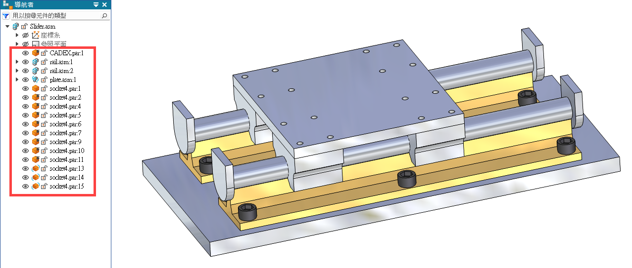 開啟一個組立件,可以看到使用了很多相同的零件。