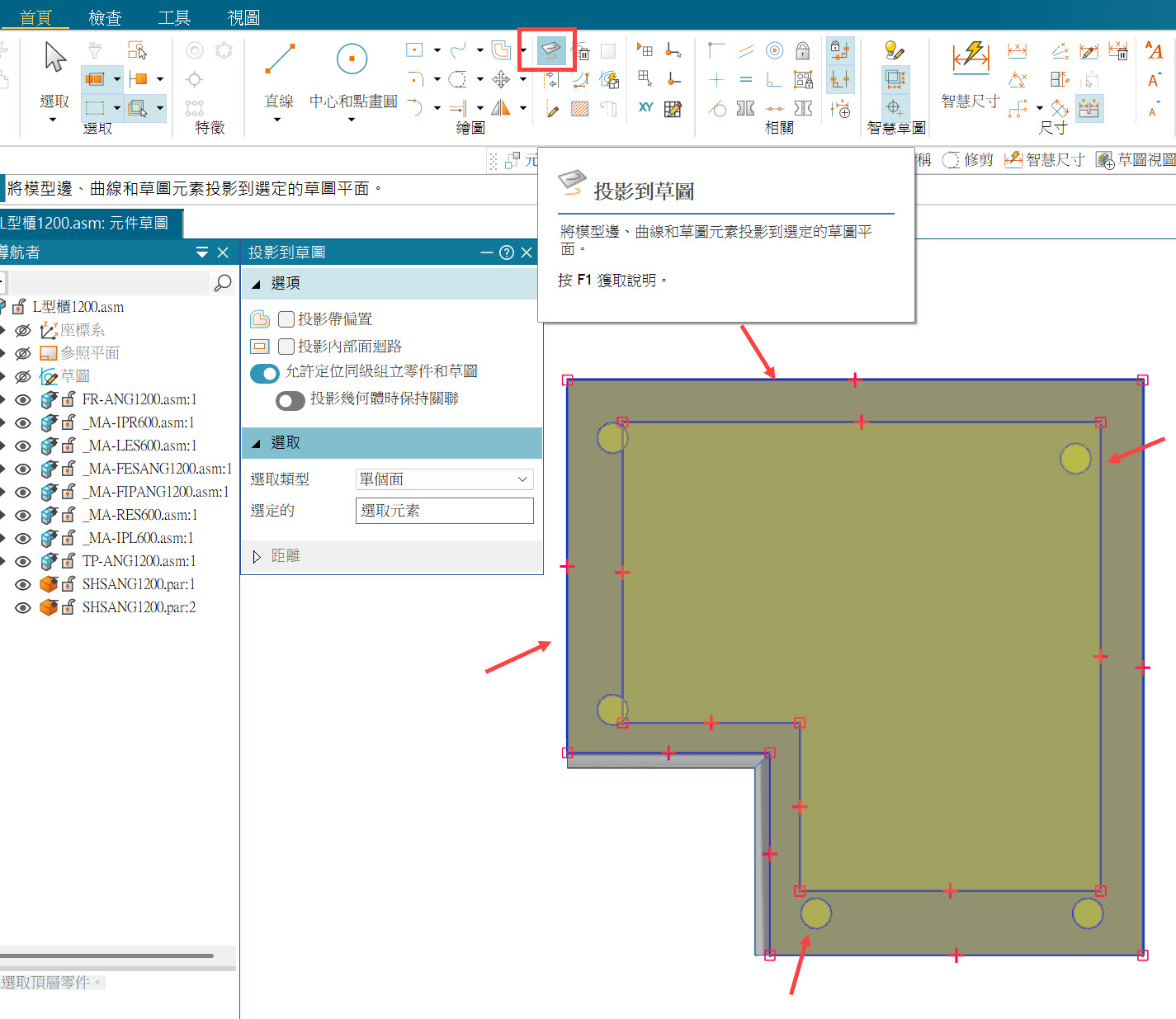 進入草圖,點選「元件影像」→ 會自動選取所有零件,點選「接受」→ 完成元件草圖。