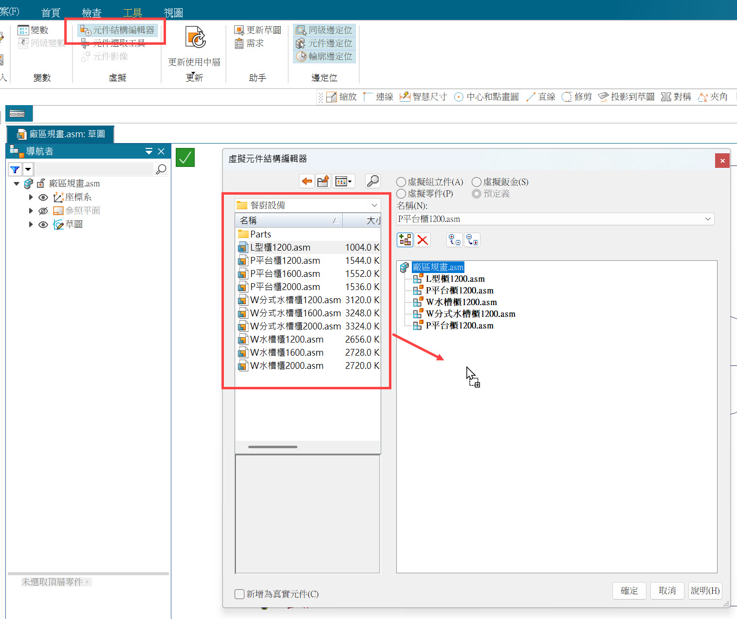 點選虛擬件→ 從導航者處拖曳到右側作圖視窗→ 選擇建立好的元件草圖→「確定」。