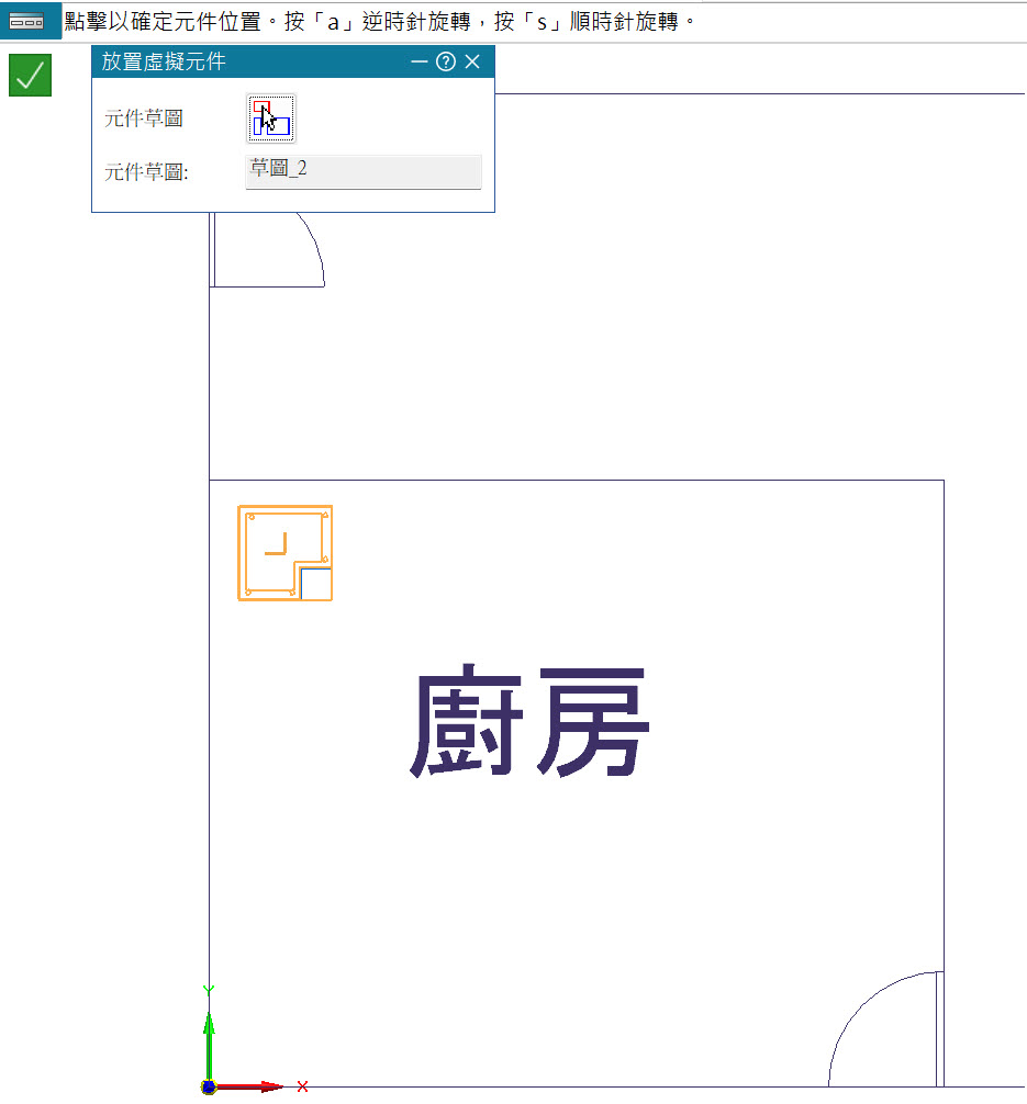 放置虛擬元件草圖的圖塊,快捷鍵做旋轉調整 ( a:逆時針旋轉、s:順時針旋轉 ),並利用鎖點、標註尺寸定位設備位置。