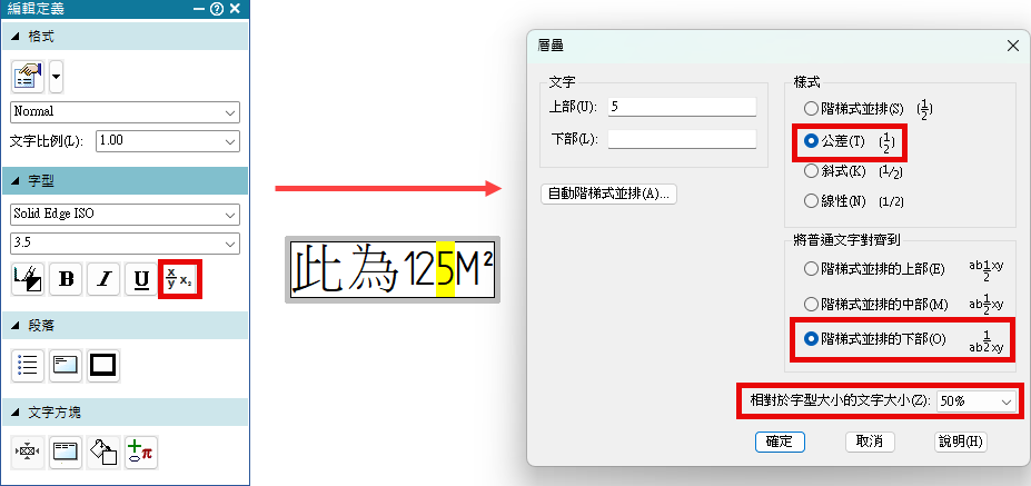 (2) 接著開啟「編輯定義」→「階梯式並排」→「樣式」,設定為「公差(T) 〔