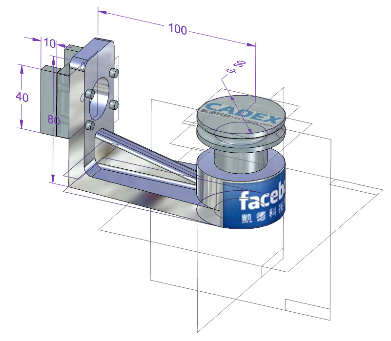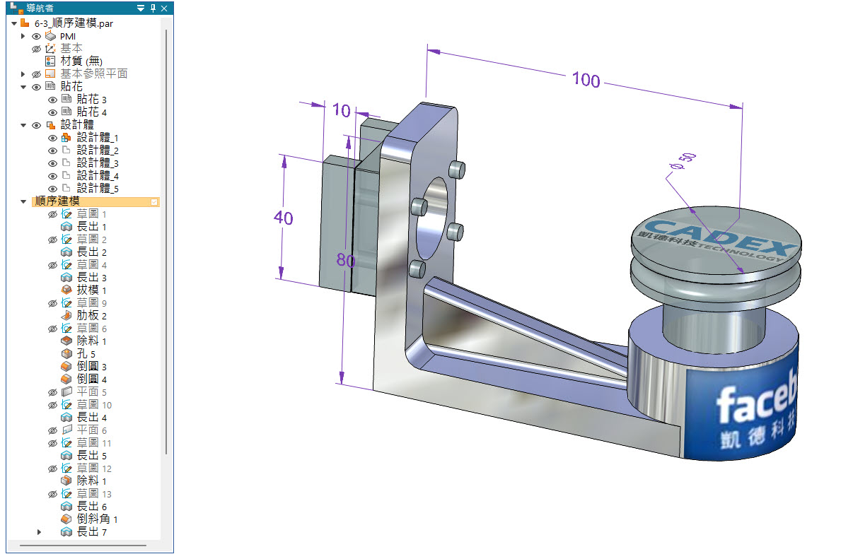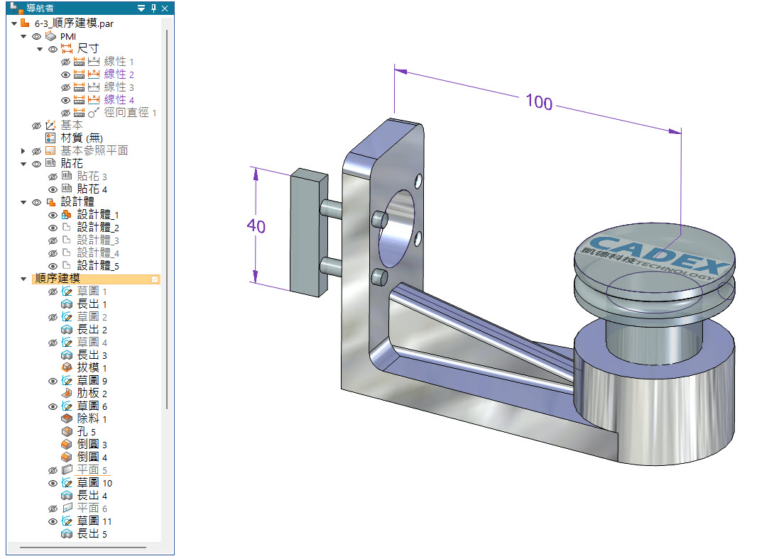 下圖中模型,「導航者」中,可以看到很多的草圖、平面、設計體、貼花、標註尺寸。