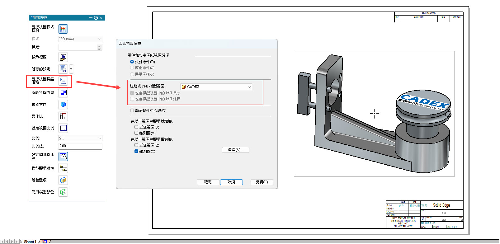 完成上述零件端的設定後,這些組態還能應用到「組立件」與「工程圖」中,實現更進一步的顯示控制。在工程圖中,可以透過「圖紙視圖精靈選項」,將「組態或PMI模型視圖」切換為所設定的組態名稱,便能精準過濾並顯示指定的草圖、設計體或貼花,讓圖面呈現更專業。